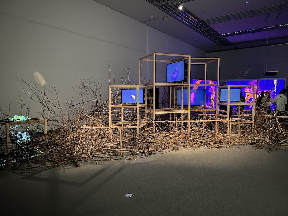 On the eighth floor, numerous video installations draw visitors through a continuous journey through and intertwine "real spaces" across different timescales. Singaporean artist Zhao Renhui, whose work "Owl, Traveler, and Concrete Sewer," has been observing and focusing on "secondary forests" since 2017, uses contrasting images of the quiet workings of nature and traces of human intervention to depict a surreal narrative of forest trees, animals, colonial relics, birds that fly in to drink from the concrete drain, and two travelers wandering through the forest.