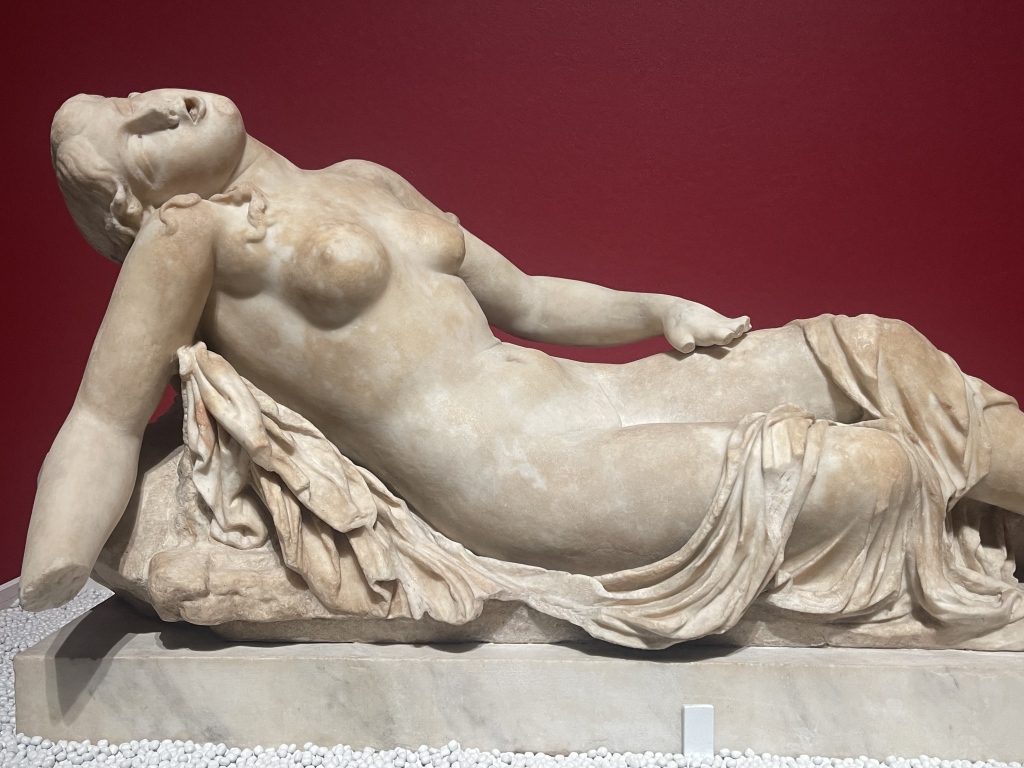 Aphrodite (Venus) is the goddess of love and beauty, and a paragon of beauty in Western art. Born from sea foam, she was revered as the patron goddess of navigation. Because her descendants founded the city of Rome, she is considered the ancestral goddess of the Roman people. The exhibited statue of Aphrodite (Venus) features a serpentine armlet on her left upper arm, her left leg bent, and a dolphin leaning beside her.
