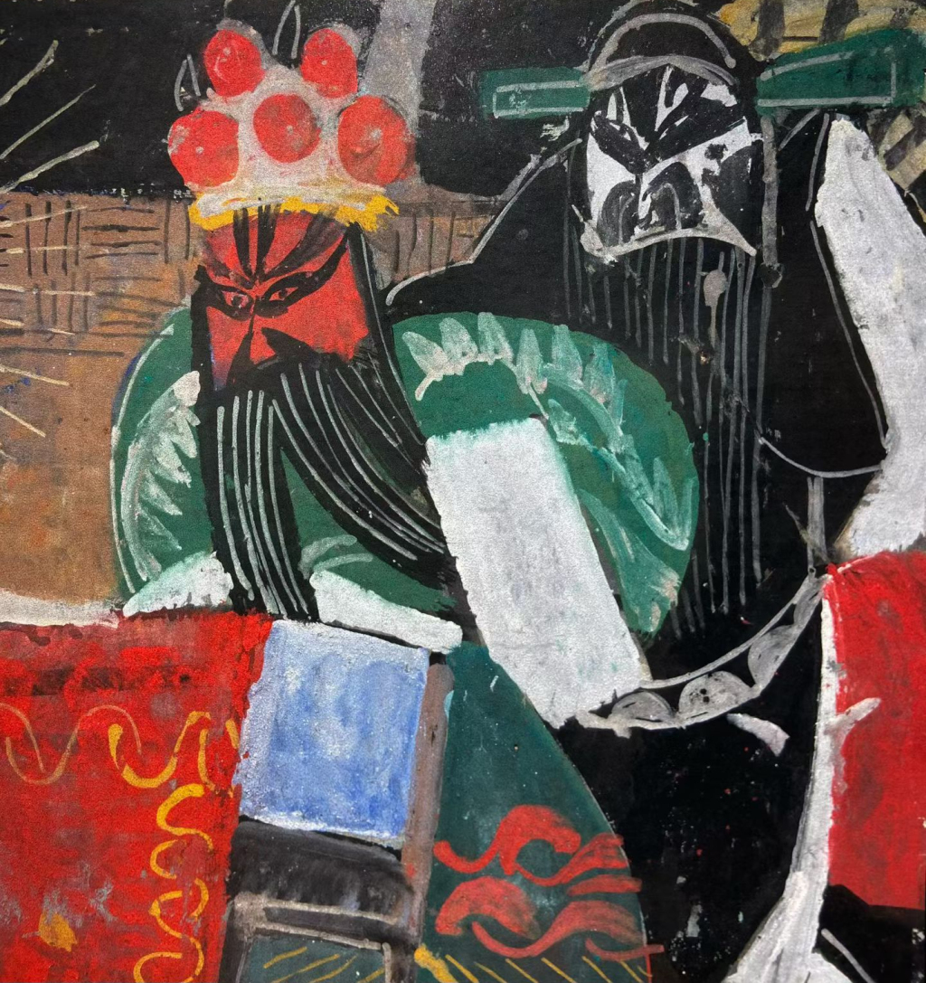 95-year-old artist Ding Liren, the oldest participating artist at the exhibition opening, said that his opera paintings originated from childhood memories, drawing inspiration from folk art and Han Dynasty paintings. "I paint operas, not in a stage setting, but mainly from listening to my nanny tell stories, like 'Journey to the West,' which was very fun. The creation of opera figure paintings is not primarily about technique, but about enjoyment." For him, opera elements are not external imitations, but a natural expression of his inner world. He skillfully combines folk art with modern consciousness, creating opera figures that are both rustic and powerful.