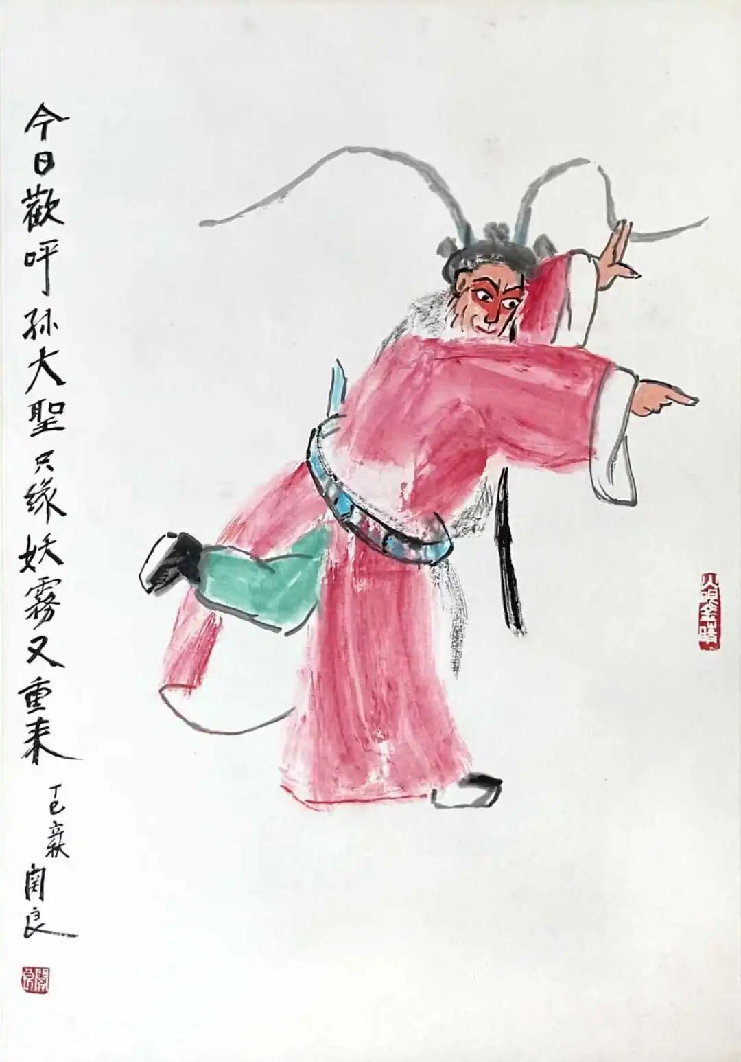 Han Yu, 94, is a master of opera figure painting. He believes in the importance of "fun" in his life, saying, "If you have fun in your heart, you will find fun everywhere." His paintings and literary creations are also full of fun. As early as the 1970s and 1980s, the animated film "Three Monks," for which he was responsible for character design, won the Golden Rooster Award and the Silver Bear Award at the Berlin International Film Festival. In addition to "Three Monks," this exhibition also showcases many of his fine opera figure paintings, such as "The Legend of the White Snake," "The Single-Sword Meeting," and "The Loss of Jieting." These paintings are small in size and at first glance look like children's scribbles, seemingly casual and light. However, they are actually very meticulous and are inspired by both folk art and reading, showing great skill in a seemingly simple way.