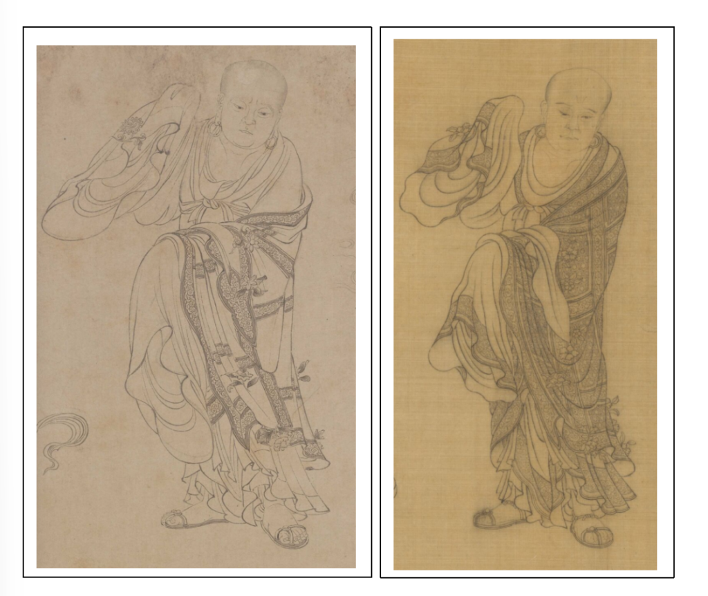Although the "Vimalakirti Sutra" and "Vimalakirti Non-Dualism" paintings are from different eras and are now in different exhibition halls, they are exactly the same in terms of structure and figure setting. The only differences are that Manjushri Bodhisattva's face is different, one without a beard and the other with a beard; Shariputra's robe is different, one with light coloring and the other with dark coloring; and Skanda Bodhisattva's expression is different, one young and strong and the other old. It can be seen that there are kindred spirits across generations, and artists of all generations admire and follow in the footsteps of each other, paying tribute to the masterpieces of the past through imitation.